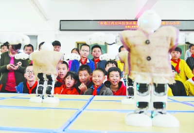 11日,泉州市泉港区科协、区科技馆联合 苏畅 石油 苏畅 组织科技文化志愿者走进界山镇玉湖中心小学,开展“石化进校园”科普文化活动,通过电子百拼体验、机器人展示、石化设备科技创新成果展示等活动,让小学生“零距离”感受科技的魅力。图为学生们观看机器人表演。林弘梫 摄