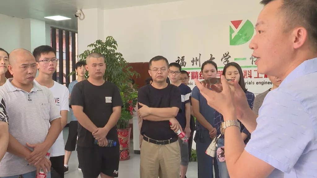 在福大-佑达电子精细化学新材料工程技术中心,12名2019年大学新生在老师们的带领下进行参观学习。据了解,该中心作为校企共建实验室,其项目分为研发、孵化、投产三个部分,此次参观学习让新生们对化工行业有了更进一步的了解。