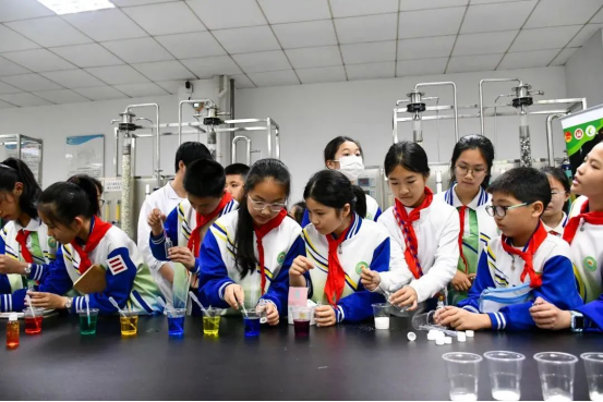 在化工实验中心,大学生志愿者带领同学们体验了“掌中火”“彩虹分层”等安全有趣的化学实验,通过沉浸式体验,抽象的化学原理变成了触手可及的奇妙现象。