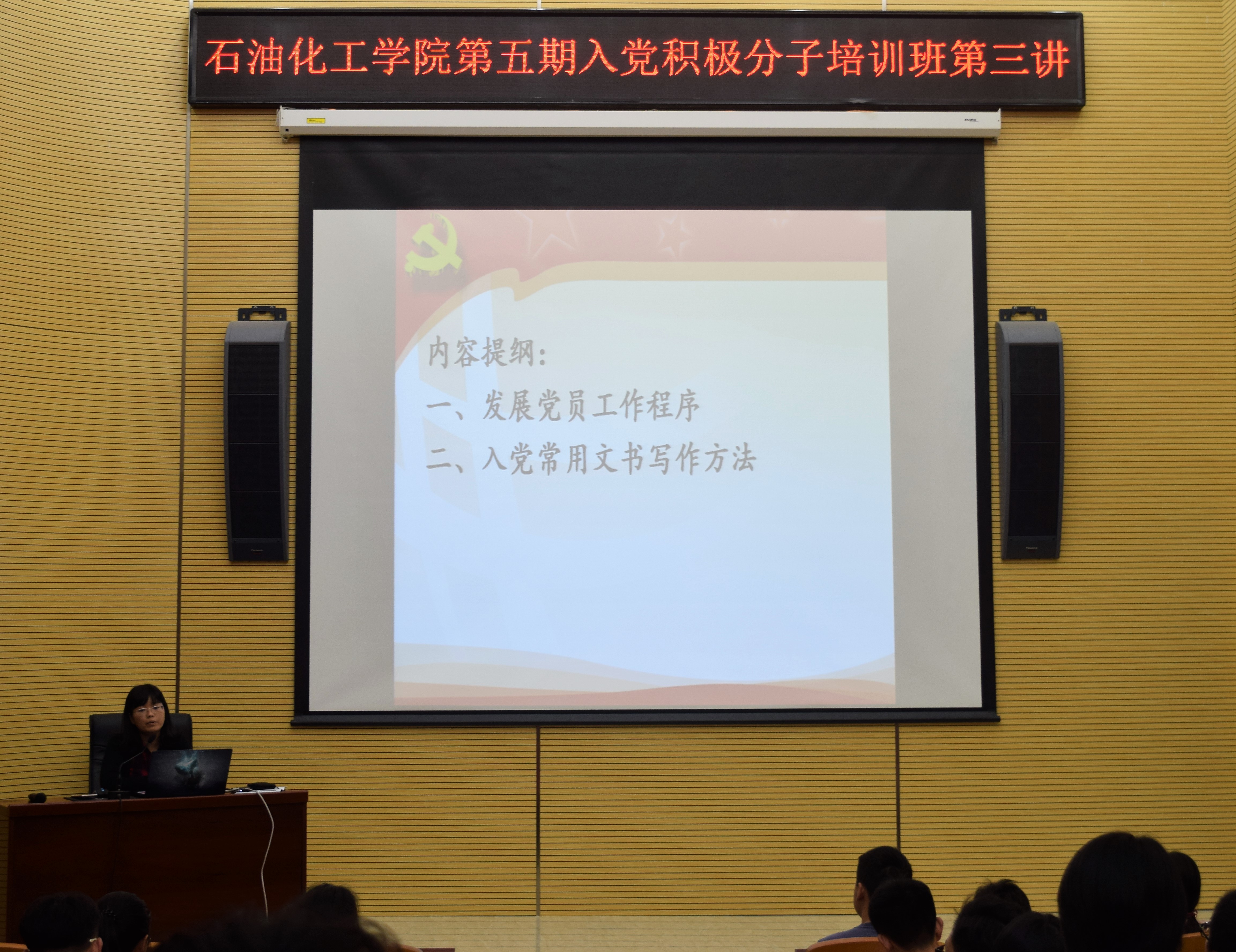 在泉港楼101报告厅举行了院分党校第五期入党积极分子培训班第三讲关于“党员发展工作流程及党员材料填写规范”专题党课学习,由院党委秘书吕蓉蓉老师主讲,旨在明确发展党员工作流程,让每一个积极分子掌握思想汇报等积极分子培养考察过程中重要文书的写作要求。