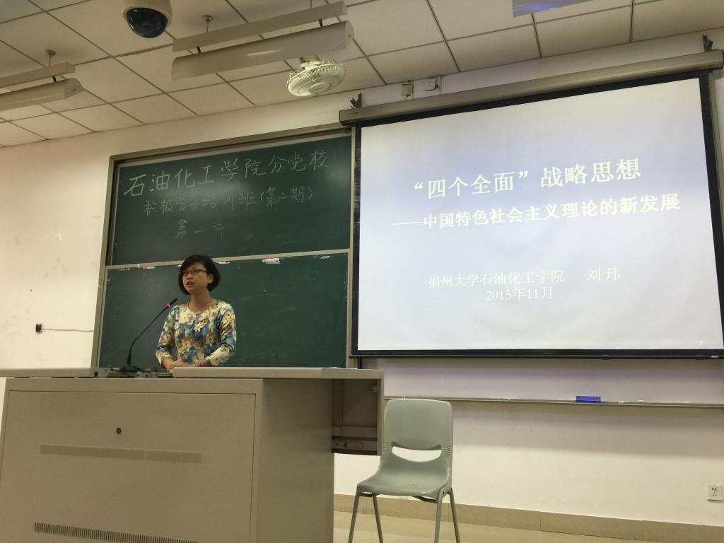 党委副书记刘玮老师,她以“四个全面:中国特色社会主义理论的新发展“为主题开展讲座。