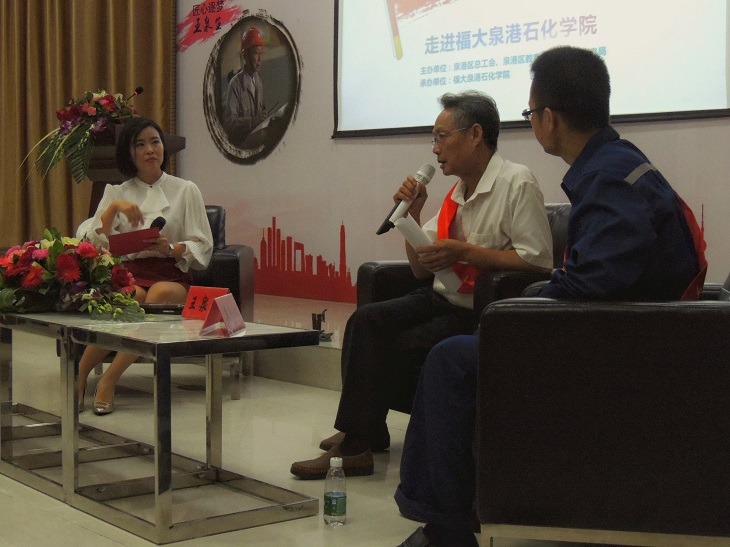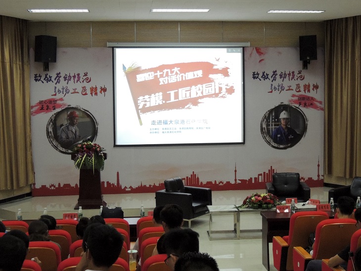 联合泉港区总工会、教育局。广电局开展“喜迎十九大,对话价值观”活动。9月27日傍晚,在泉港校区教学楼105教室,来自福建迅达石化工程有限公司的王泉生总经理和福建联合石化有限公司的吴良江工程师走进石化学院,为同学们带来了一场关于“工匠精神”的对话。