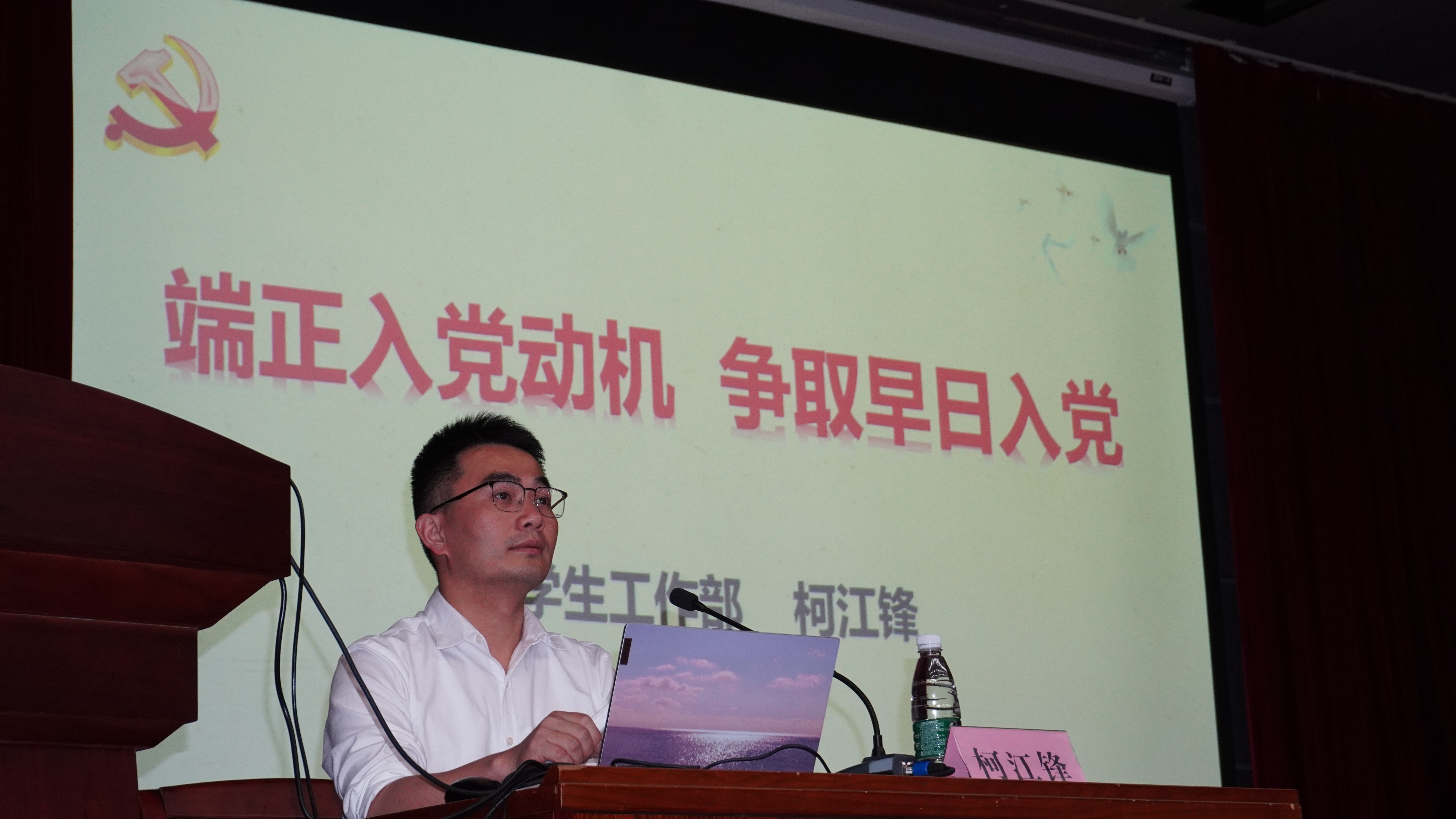分党校党史学习专题讲座暨第八期入党积极分子培训班第四讲于图书馆明德厅正式开讲。此次培训由校学生工作部副部长柯江锋老师主讲,院团委书记伍宇翔老师主持,旨在端正同学的入党动机,明确入党动机内涵,树立唯一正确的入党动机。