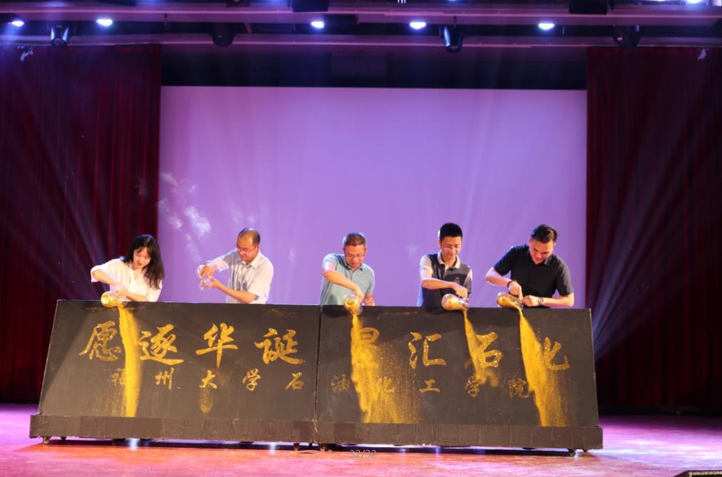 最激动人心的环节当属“鎏金倒沙”环节,到场嘉宾们依次倒入金沙,象征着在中华人民共和国70华诞的重要时刻,开启我们石化学子砥砺奋进的新征程,晚会也在高潮环节后落下帷幕。
