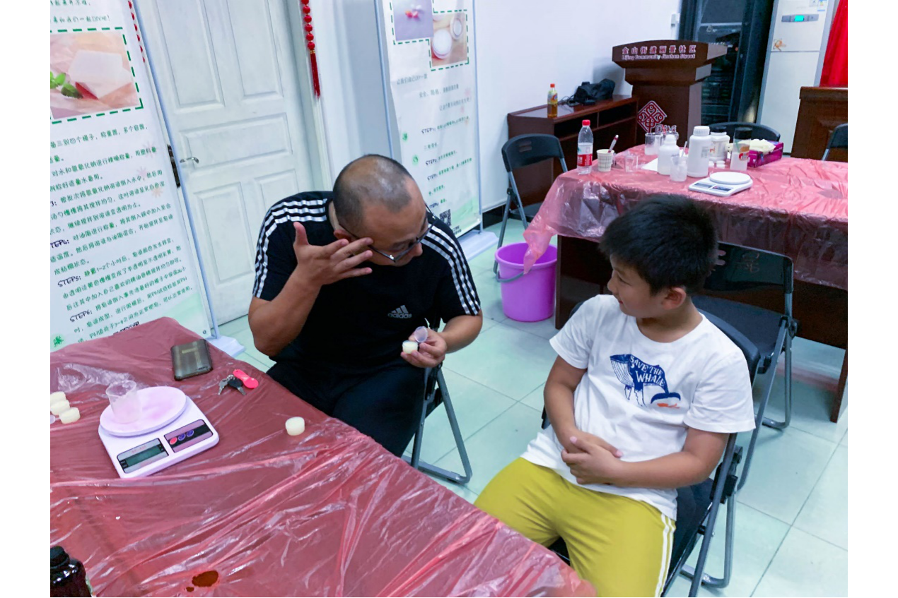 队员们告诉居民,手工皂是通过氢氧化钠溶液和油脂加热反应而制成的,将混合液加热搅拌至粘稠后加入香精色素,再倒入模具中凝固,就可以制成不同颜色不同形状的手工皂。实践队提供了一套十二星座模具和一套十二生肖模具供居民选择。来制作手工皂的小朋友先选择自己喜欢的颜色,由实践队员帮他们调制成皂基。“我是狮子座。”一位小朋友拿起一个狮子模具,队员把皂基倒入模具中。她还制作了一个生肖鸡形状的手工皂:“带回去送给外婆!”手工皂凝固需要一个小时,实践队员请小朋友们下午来拿成品,期望这些孩子们带走的不仅是手工皂,更有绿色化工的知识和环保精神。