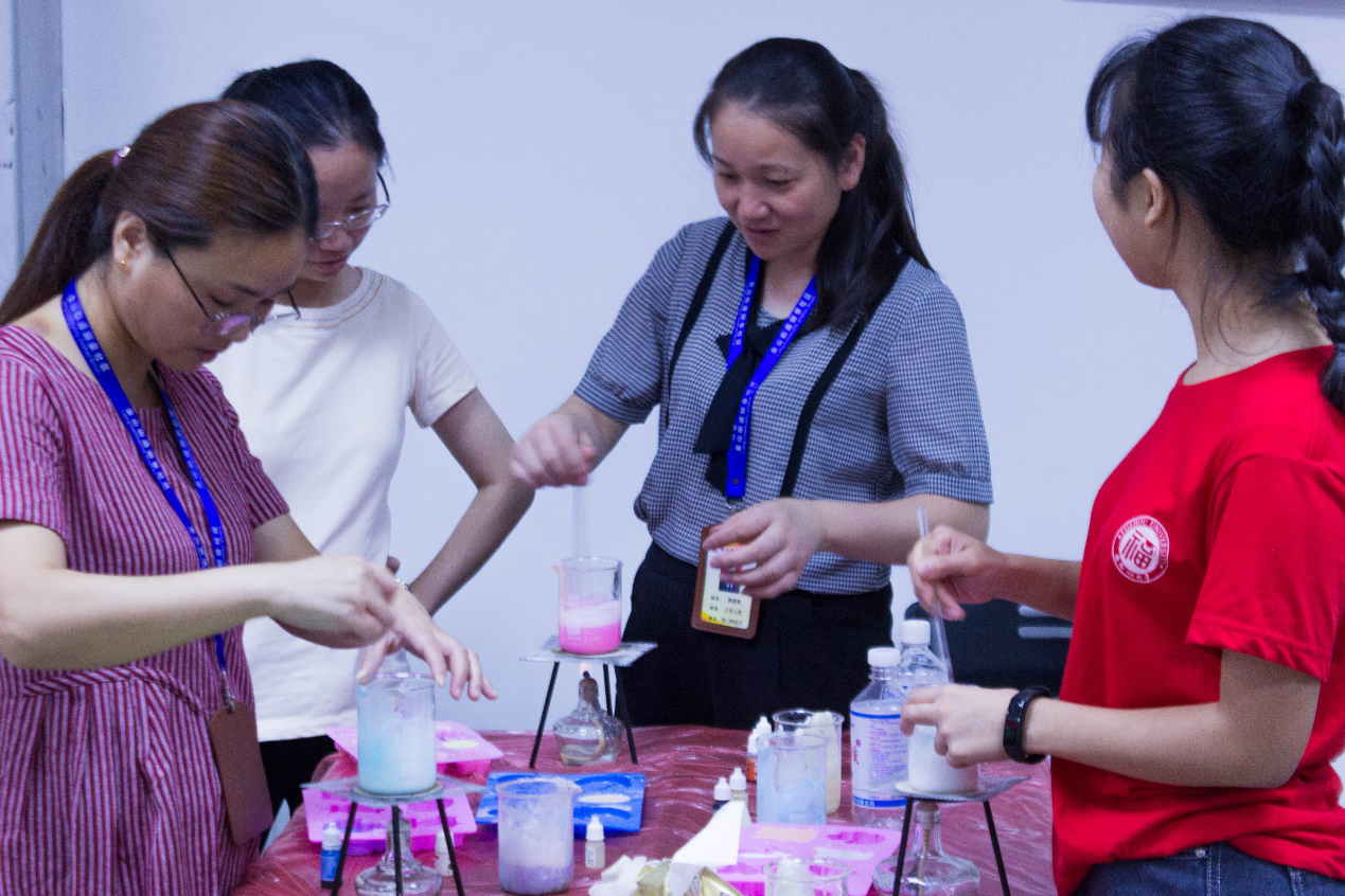 为推进绿色化工产品进入家庭生活,福大石化学院赴丽景社区实践队于7月18日开始了第四期实践活动。这天实践队员带领居民亲手制作制作了手工皂、刷鞋膏、清凉膏等日常生活用品,并向居民们普及它们的制作方法。