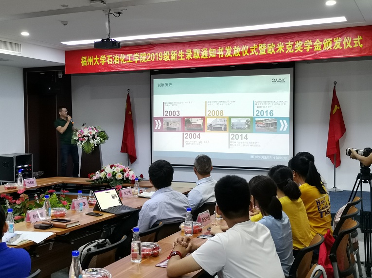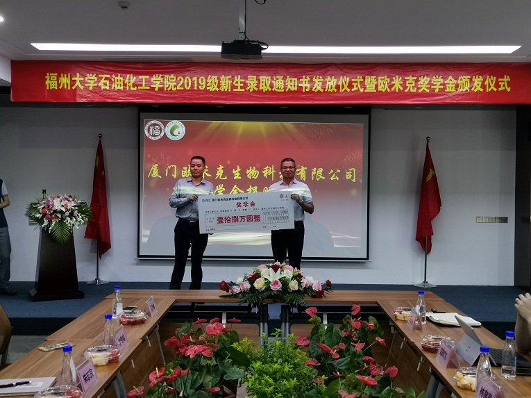 在厦门欧米克生物科技有限公司进行2019级录取通知书发放仪式暨专业教育进企业活动。院党委副书记岳志强副教授、副院长郑辉东教授、辅导员林泉富、何杰,厦门欧米克生物科技有限公司董事长邓志敏先生等企业人员、2019级厦门籍新生及家长出席本次活动。