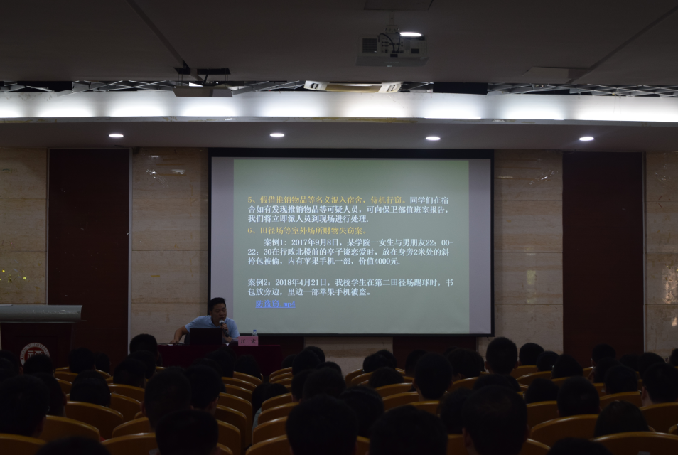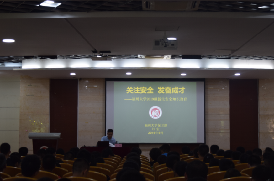 素拓报告厅顺利举行。院邀请校保卫部治安科江宏老师为19级全体新生上了一堂生动的安全教育课。出席本次讲座的有19级新生辅导员林泉富。