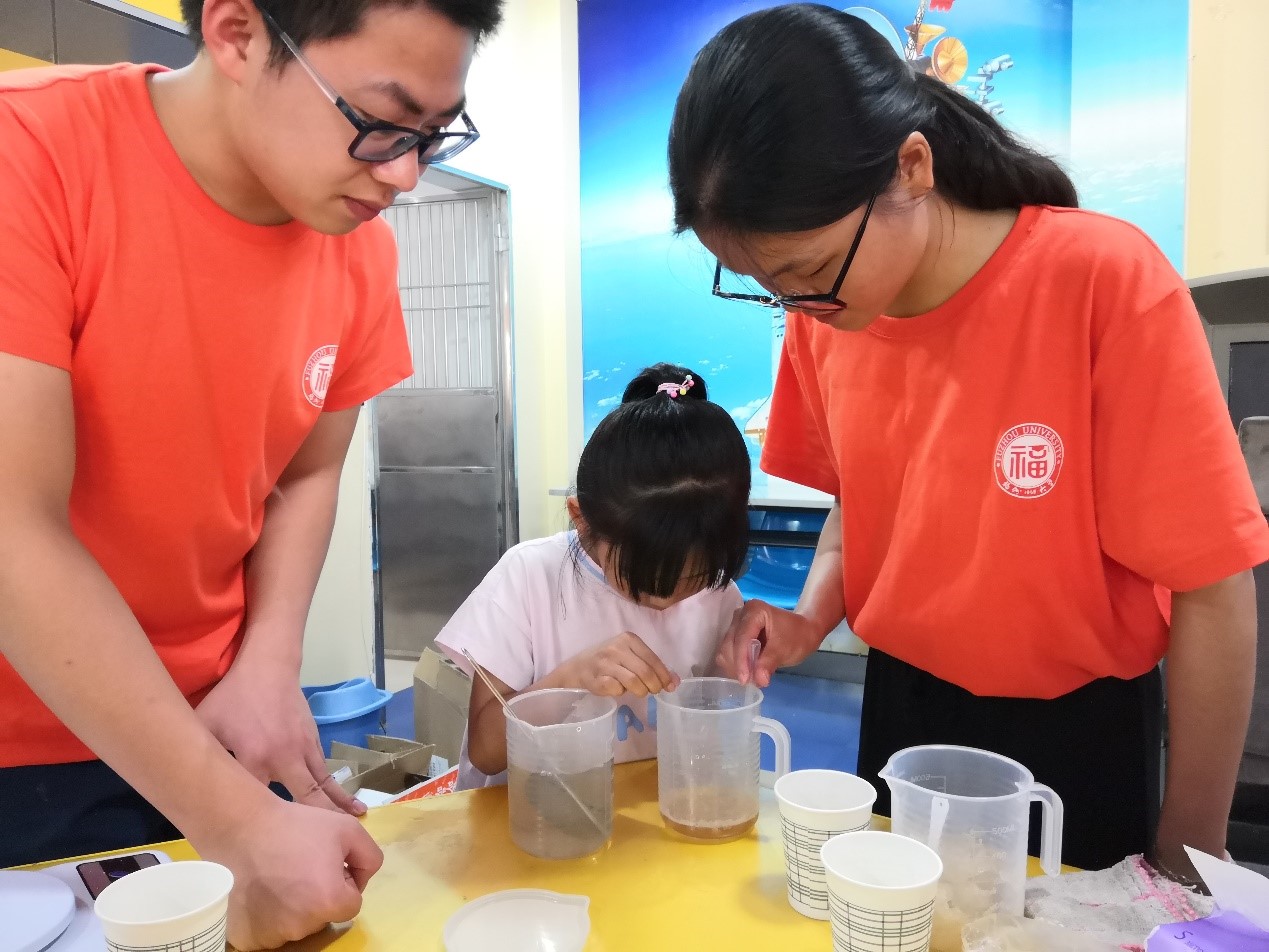 下午,实践队展示了爆爆珠、水晶宝宝两个实验。海藻酸钠溶于冰红茶,滴入乳酸钙中,爆爆珠就成型了,配上冰红茶,一杯饮料就完成了。其中一位小朋友在品尝完后说道:“我要做一杯带回去给我妈妈喝。”这句话使得队员们很是开心;与此同时,五颜六色的水晶宝宝也吸引了不少小朋友的关注。队员们将提前配好的透明溶液混入喜欢的色素,用勺子倒入凝固液中使其成型,五彩缤纷的水晶宝宝也就完成了。有趣、简单好玩的实验是小朋友发现化工魅力的最好的启蒙。与其说是实验,更像是有趣的游戏,在做实验的过程中,寓教于乐,让小朋友们感受化工的生命力和创造力。