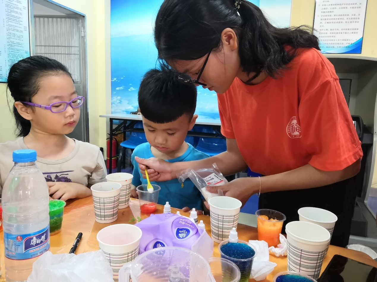 同时,队员们也展示了吸水树脂的实验。吸水树脂具有良好的吸水性和一定的保肥性,吸水后体积会扩大到几百倍或几千倍,能为植物的生长提供养料和水。将颜料、营养液和吸水树脂加在一起,混合上水就可以做成五颜六色的土壤,不仅实用还有很好的观赏价值。实验快要结束时还有小朋友对吸水树脂恋恋不舍,直到感受完其超强的吸水能力后才肯离开。