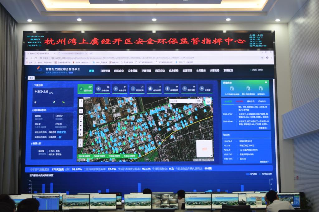 下午队员们在何学长的带领下,参观国内乃至世界首创的上虞经济开发区异味检测系统和安全环保监管指挥中心。这是针对化工园区普遍遇到的监管难、追溯难的问题,在何师兄牵头下开展的信息化综合治理体系的探索,通过信息化、大数据等手段,实现了对企业生产全过程污染物的“可评价,可溯源,可预警”。面对着一目了然的园区各项数据和以亿为单位的投入,队员们深刻体会到了先进理念和信息化对化工和环保行业的巨大改变,也深深感受到了肩上的重担。