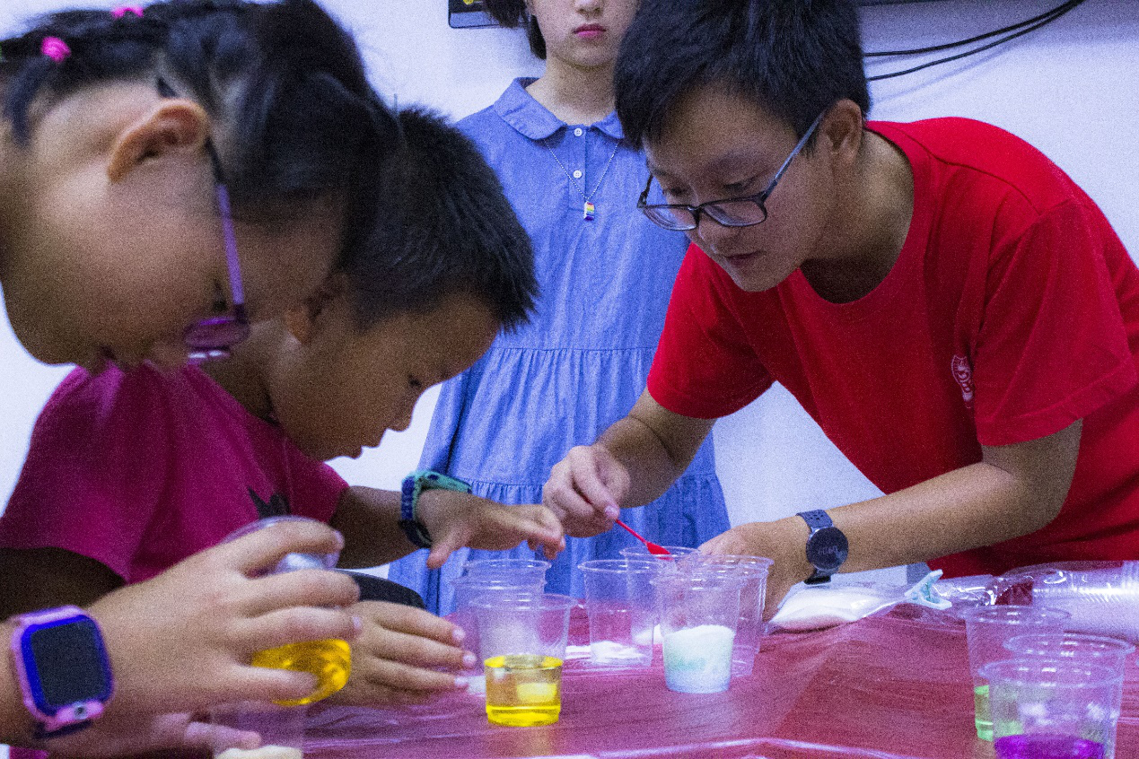 实践队伍还制作了吸水树脂,一种具有很好的吸水性和保肥性的植物养料其制作同样是十分简单而具有实操性: 将颜料、营养液和吸水树脂加在一起,再加上水就可以做出五颜六色的土壤。实践队员把半成品装入杯中,并提供了各种颜色的色素供孩子们选择。在实践队员的鼓励下,小朋友们发挥自己的想象力,混合各种色素制造出了极具观赏性的树脂。
