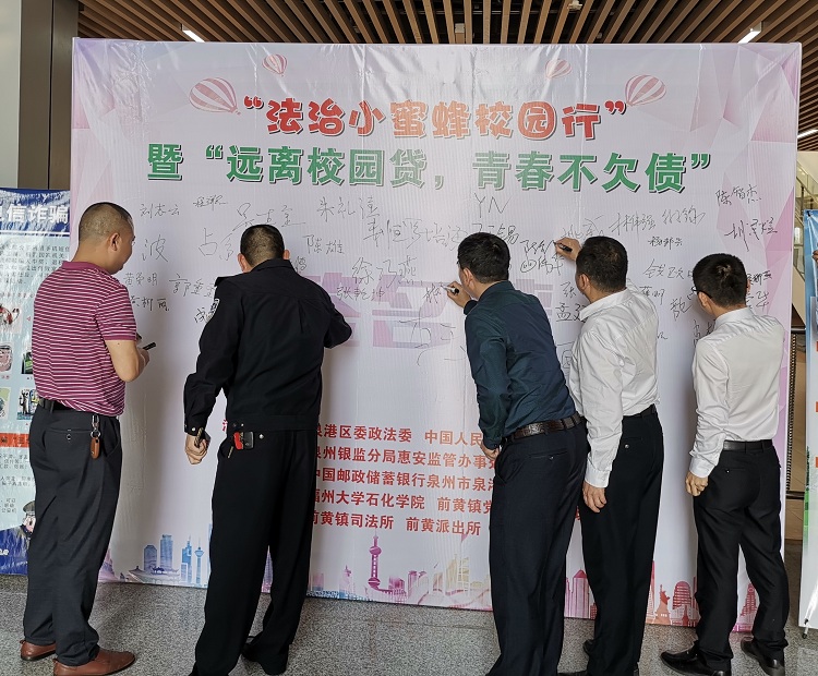 石化学院,前黄镇党委、政府,前黄镇司法所,前黄镇派出所,中国邮政储蓄银行泉州市泉港区支行承办,旨在呼吁同学们对校园贷的危害能有正确的认识,树立正确的消费观,提高大学生们的金融知识,加强个人信息、支付安全意识。