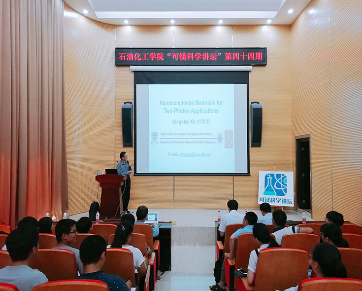 本次讲座吸引了众多学生和老师参加。讲座开始之初,徐清华教授亲切的慰问在场师生,得到了全场师生们热烈的掌声,诙谐幽默的谈吐更为本次讲座带来了轻松的气氛。徐清华教授主要介绍了金属纳米颗粒等离子体增强双光子光致发光的研究背景以及如何利用纳米复合材料来增强双光子激发性能的最新研究进展,其带领的课题组在贵金属纳米颗粒增强等离子体双光子光致发光研究中取得了一系列进展,该课题组主要基于两种途径来制备用于双光子激发技术的纳米复合材料,一种途径是基于具有高双光子吸收截面的共轭高分子作为能量传输媒介,增强双光子吸收效率并成功用于双光子探测,成像和光动力学疗法等方面;另一种途径是利用贵金属纳米颗粒的等离子体共振性质设计的复合材料来提高双光子的激发和发射性能,并成功应用于双光子探测方面。在提问环节,徐清华教授鼓励同学们积极发言,并对同学们提出的问题耐心讲解,现场讨论气氛十分热烈。徐清华教授的讲座大大激发了同学们对金属纳米材料新的兴趣和认识,拓宽了同学们关于金属纳米材料研究的新视野,对同学们大有裨益。更对 苏畅