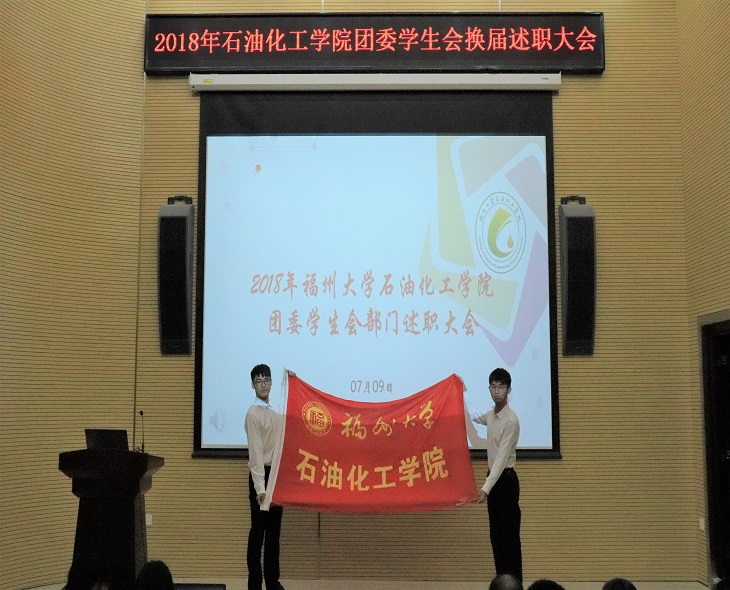 随后举行的主席团交接仪式上,2017届学生会主席杨剑豪和研究生会主席卓雪松将学院旗帜分别移交给新一任团委学生会主席庄家豪和研究生会主席邹南。院旗的交接象征着石化学子“谋在旗山,拼在泉港”的“狼兔”精神代代传承。