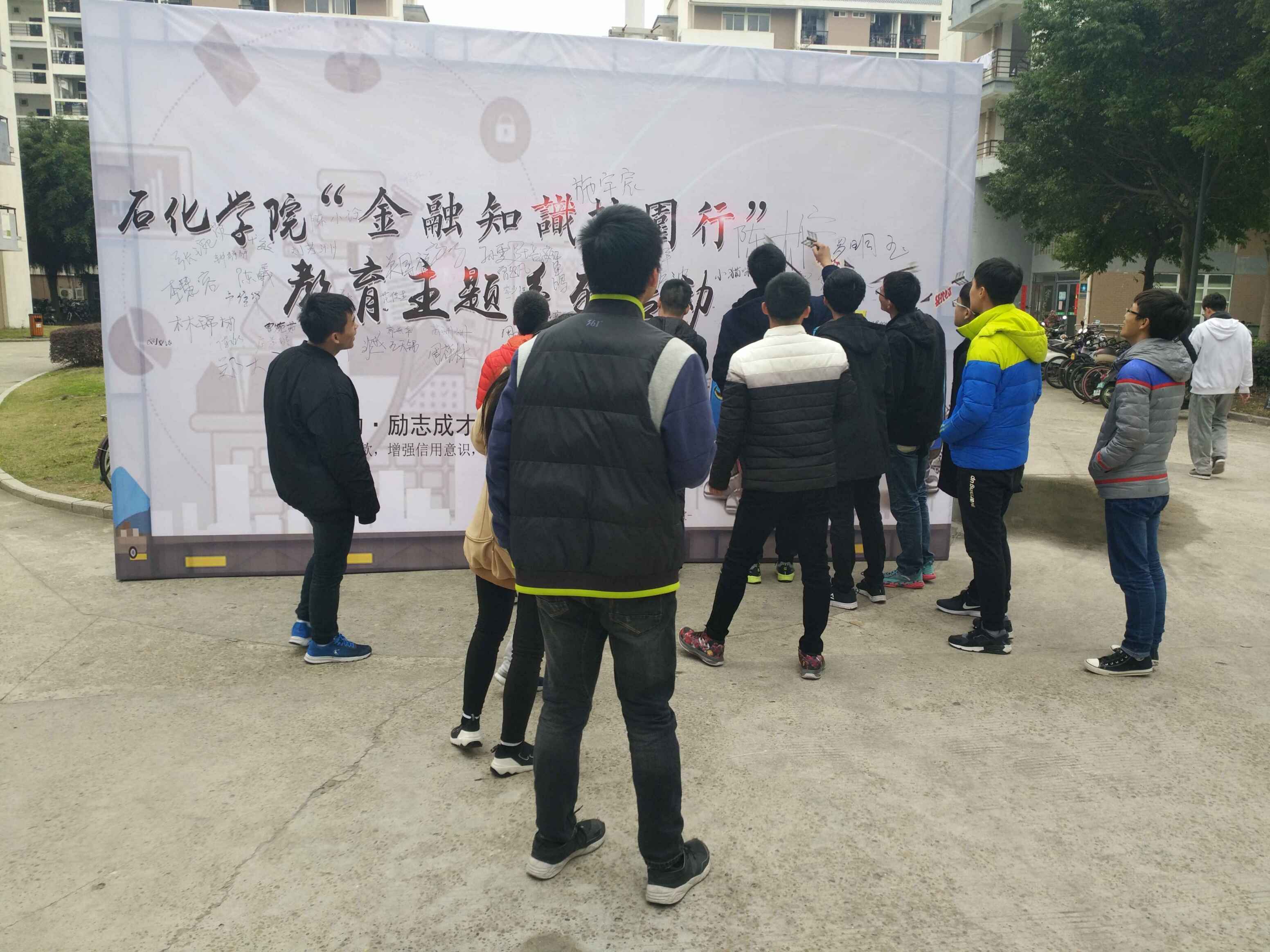 在生活三区开展了“金融知识校园行”教育主题系列的签名活动。同学们积极参与其中,在宣传板上郑重地签下了自己的名字。