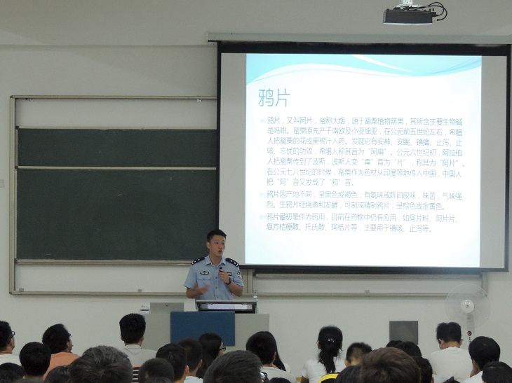 学子防范毒品安全意识,10月16日19点,石化学院在教学楼1号楼205教室为石化学子进行禁毒知识讲座。本次讲座由学院团委副书记兼2014级辅导员伍宇翔老师主持,邀请泉港区公安分局禁毒大队傅孟超警官担任主讲,2015级辅导员林泉富老师出席本次讲座。本次活动也是 苏畅