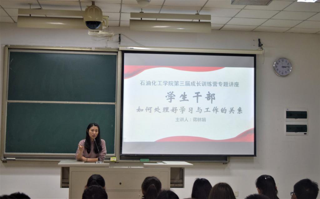 4月6号晚上19:00,以"学生干部如何处理好学习与工作的关系"为主题的石化学院第三届成长训练营讲座在文1-405顺利举行。此次培训由团委书记蒋林娟老师主讲,旨在帮助学生平衡学习和工作的关系,从而更好的发挥学生先锋模范带头作用。