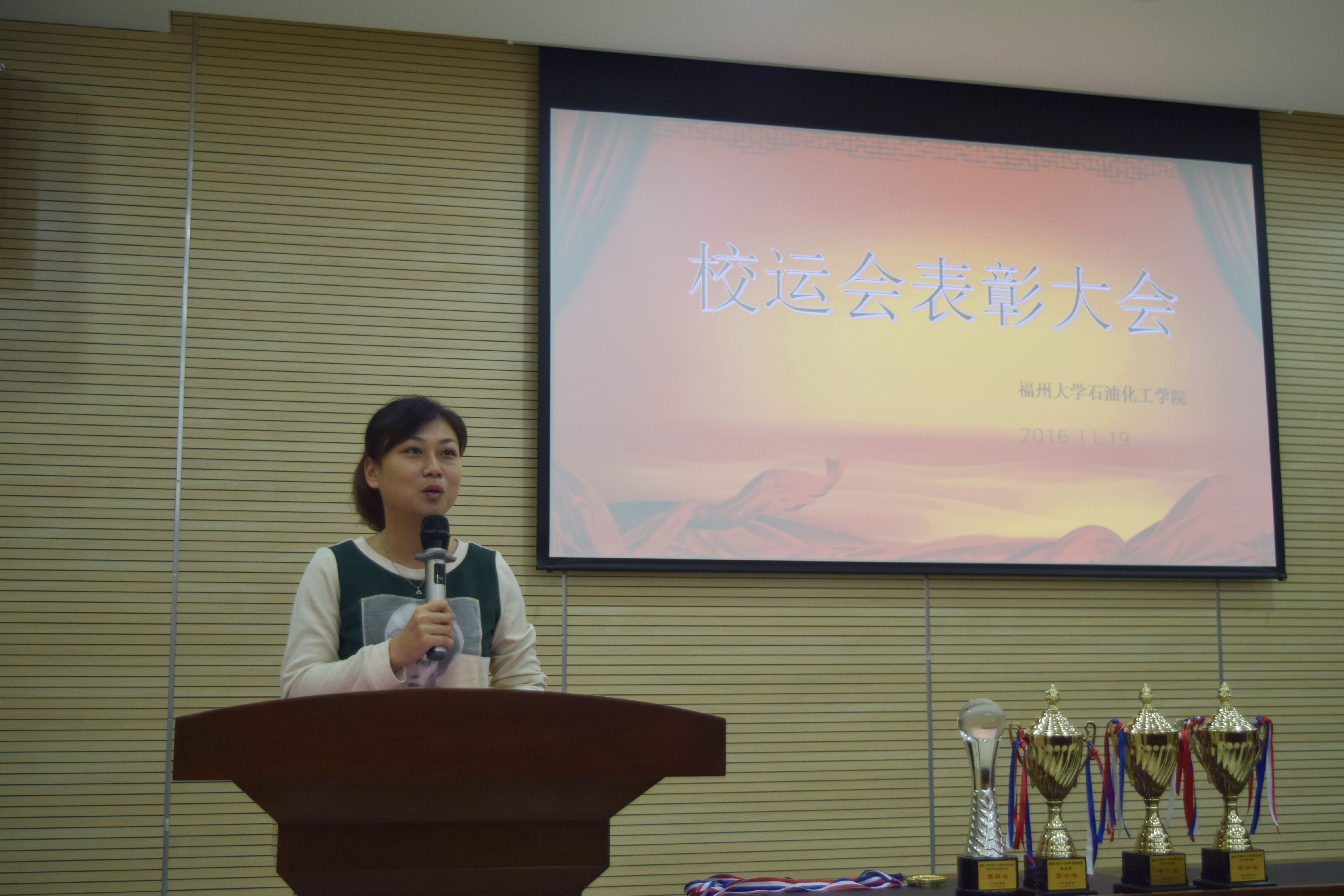 大会之初,院团委学生会体育部部长陈志豪用一段视频展现了本次校运会中石化健儿们的体育风采。随后,院团委书记蒋林娟老师宣读本次校运会的先进个人表彰名单,并进行先进个人的颁奖仪式。颁奖完毕,14级辅导员林泉富和运动员代表张金腾分别发言,他们分别以学院体育负责人和校运会老将的身份,分享了就学院体育方面成就的感言和石化精神在体育中的传承。最后,院党委副书记刘玮老师发表讲话,她对校运会的全体运动员表示感谢,并表达了对学院体育事业几年来持续腾飞的震撼之情。刘玮老师还鼓舞大家将勇于拼搏的体育精神贯彻到学习工作和人生奋斗中去,创造新的辉煌。