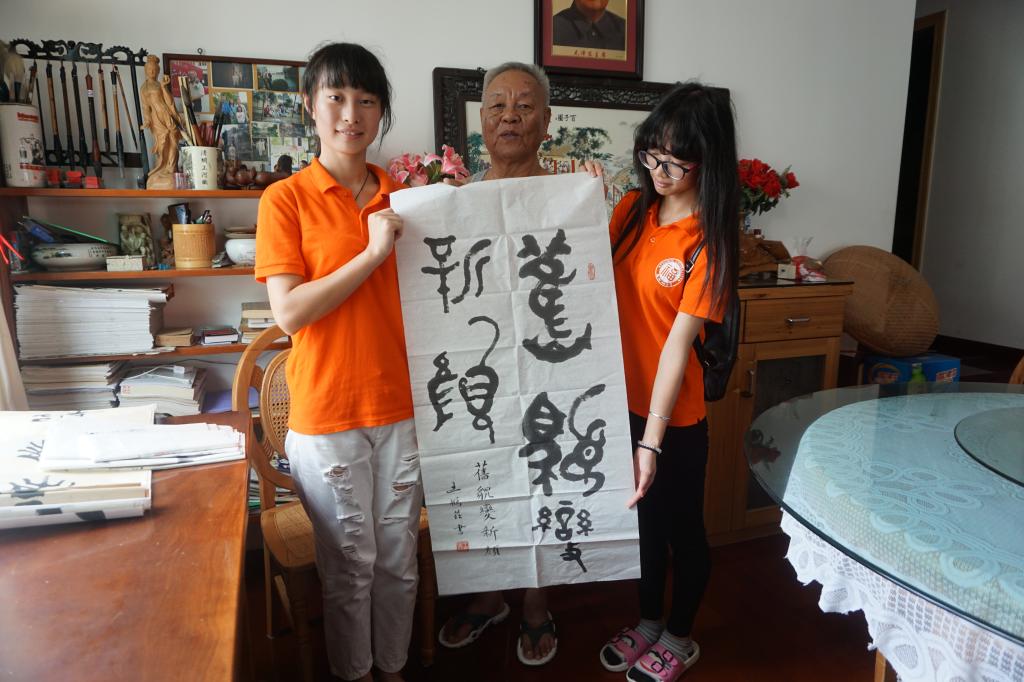 实践队登门拜访了社区内一名书法爱好者王鹏兹老先生。老先生对于实践队员的到来表示十分欢迎,并向实践队员们展示了其优秀作品。老先生自诉其从小喜欢书法便开始自己研究学习,比较擅长隶书,对其他字体也有研究,有一个自己的平时练习书法的小角落,堆满了他的作品以及笔墨纸砚,他说写出好的字,在笔墨纸砚上也有讲究,并介绍了不同的墨水,纸和各种号的笔。