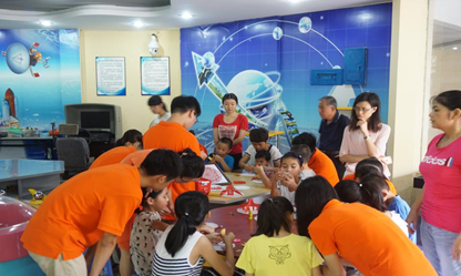 手工课上,实践队员都坐在小朋友们旁边,成了孩子们的一员。他们一边跟着老师剪纸,一边细致耐心地协助孩子们,专注的脸上也显出了几分稚气。