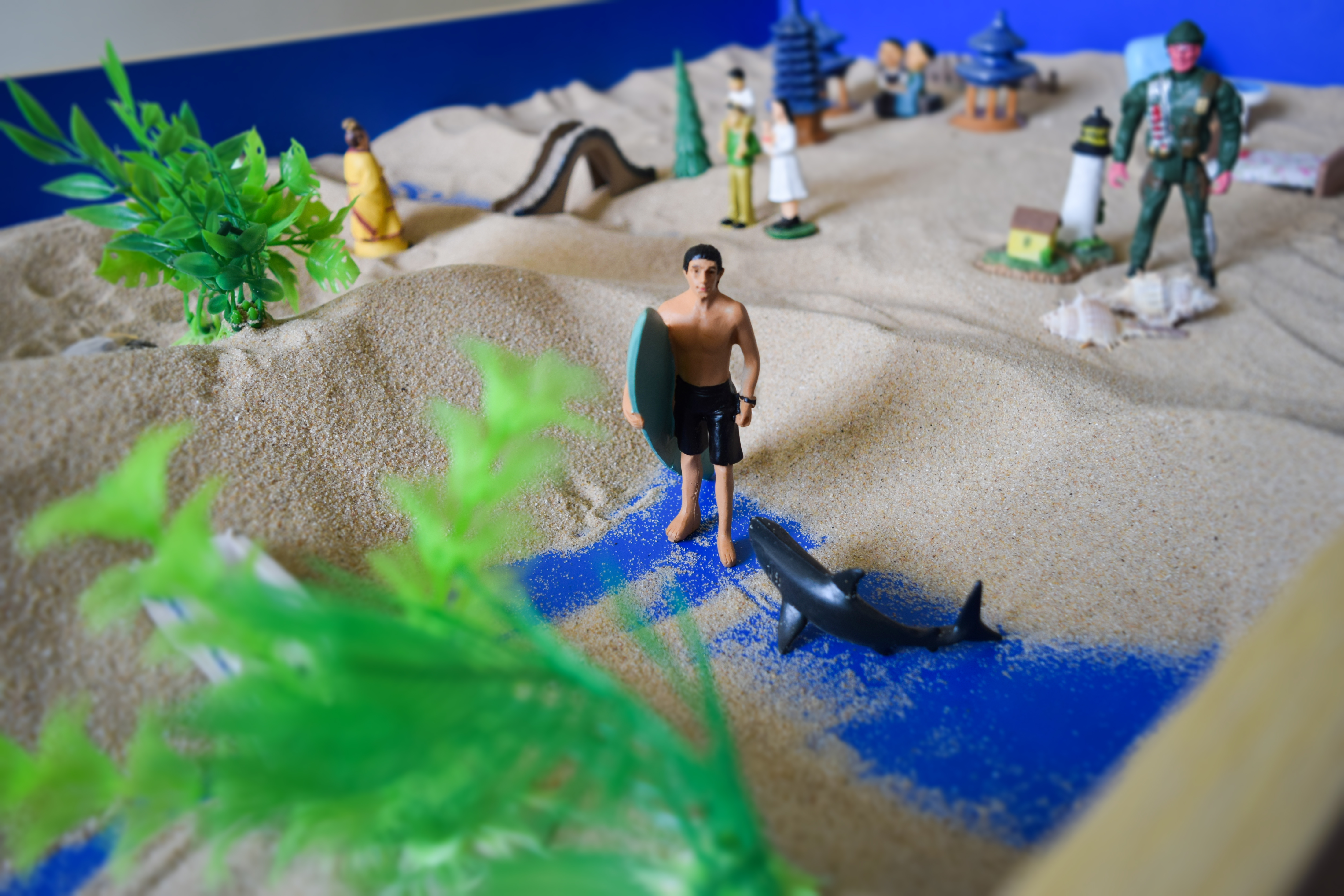 活动开始,大家依次从架子上挑选小模具,摆放在沙盘中,由最后一个人修饰整个沙盘的物件摆放。在这个创作过程中,大家默默无言,观察和思考,然后不断地完善整个沙盘呈现的世界。从最开始的桥、塔,到海、昆虫,到一对父子、两位相依的老人。因为不能交流,大家或是努力表达自己的想法,或是尽力理解他人,来一起配合着创作和完善这个属于他们的世界。活动过程中,老师也鼓励学生各自分享创作中的想法。