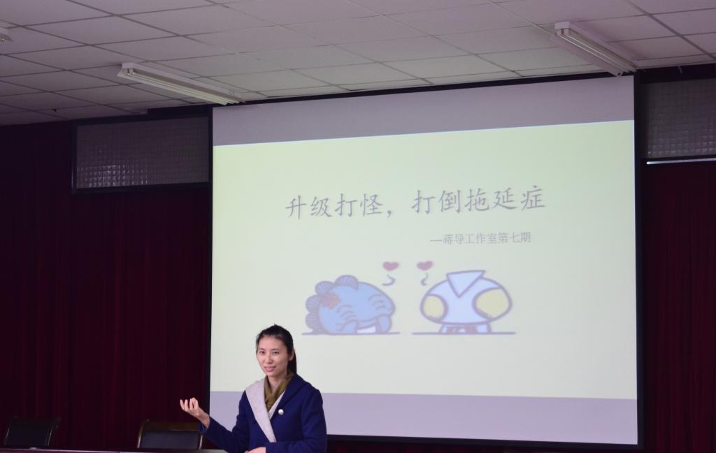 为了让同学们打倒拖延症,养成良好的习惯,12月10日中午,蒋导工作室第七期“升级打怪,打倒拖延症”活动的开幕式于嘉锡楼413举办。蒋导工作室创始人蒋林娟老师出席本次活动。