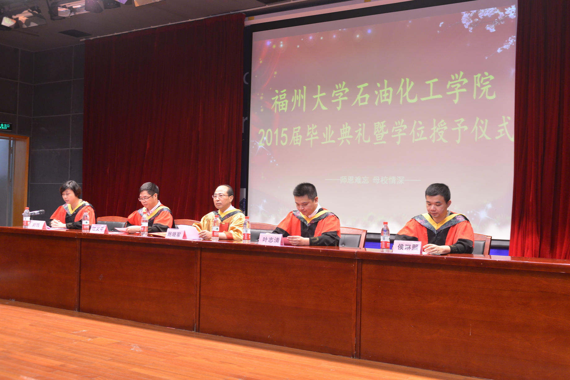 紧接着刘玮副书记宣读2015届毕业生推荐的“我心目中的好老师”名单。老师们上台领奖,毕业生代表向老师献上一束鲜花,感谢老师的教导和栽培,祝老师身体健康,工作顺利。好老师代表阮奇教授发表热情洋溢的讲话,这位化工原理任课老师,风趣幽默,与台下学生互动,他祝愿毕业生在新的岗位,新的环境中能够不断进步,取得更大的成就,并和学生们约定20年后再相聚。