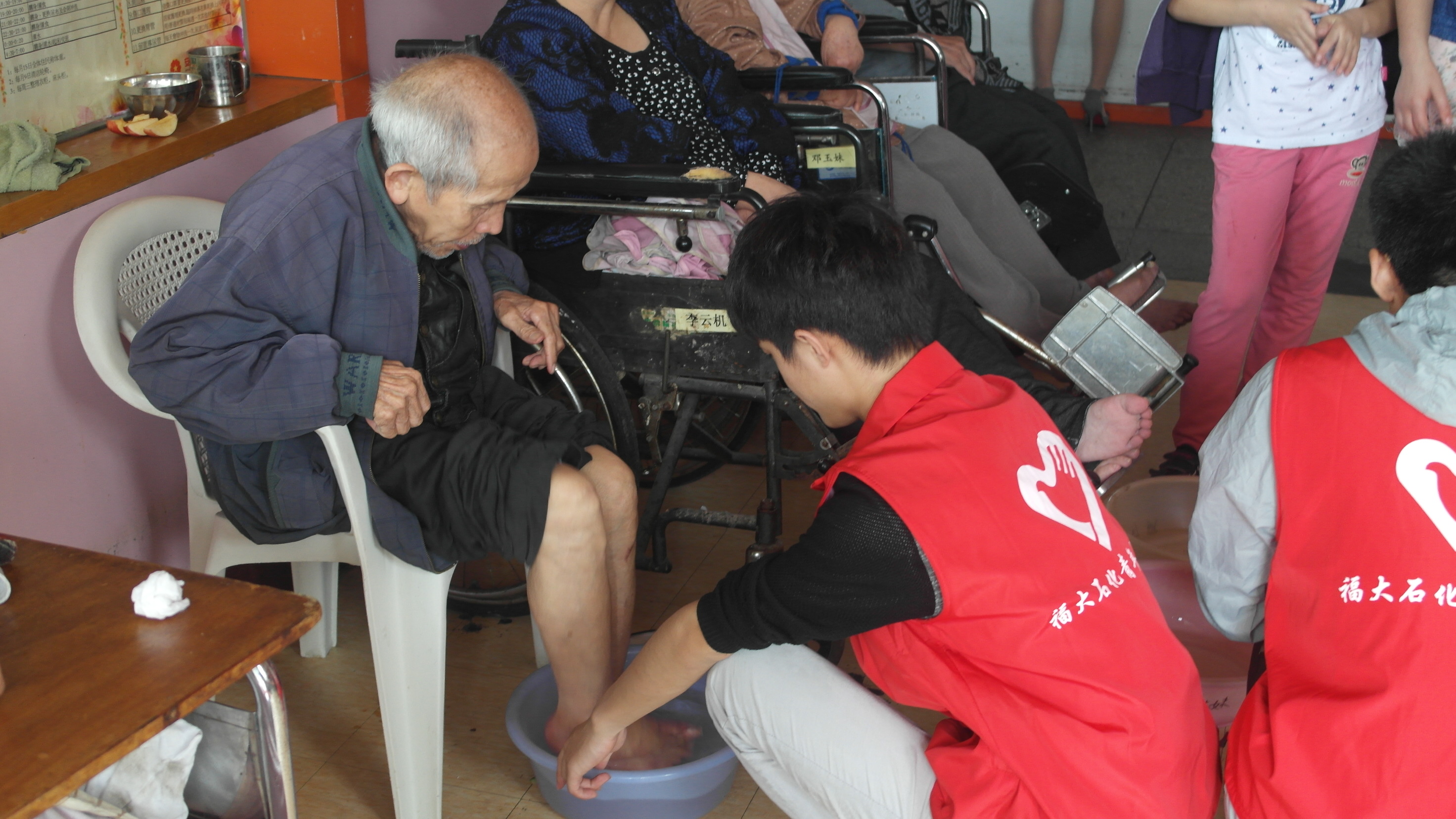 今天志愿者们的主要任务就是给爷爷奶奶吃水果,洗脚,剪指甲。本次活动带去了苹果,香蕉,还有一个大西瓜。叶姐带着志愿者们去厨房,帮着厨房阿姨把这些水果洗洗切切。苹果足足切了一大盆,叶姐说:“这次的水果都够全院的老人吃了。”切完后,志愿者们各自拿着水果,分发给老人。有的吃苹果,有的吃香蕉,还有的吃西瓜。不仅如此,志愿者们还为老人们洗脚,一盆盆的温水端了过来,志愿者们有蹲着的还有干脆席地而坐的为老人洗脚,只为老人们有个舒服的下午。其中有位老人为表感谢,竟然都唱起了歌,像《打靶歌》《东方红》等红歌,唱起来雄赳赳气昂昂,说起中国来非常的自豪。唱完之后每个人的心都暖暖的,都被这位老人的话语感动。
