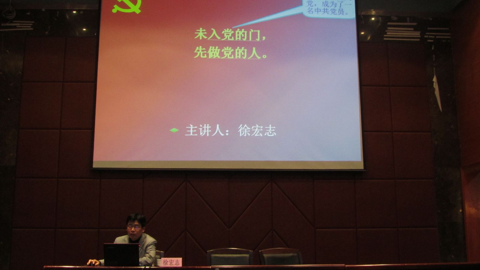 邀请到校党委组织部徐宏志副部长为入党积极分子做第四讲培训:《未入党的门,先做党的人》专题报告。他详细地阐述了《中国共产党发展党员细则》,全面地介绍了发展党员的整体工作及注意事项,内容详实、条理清晰、语言幽默。同时他强调入党积极分子应当做到身未入党,思想先入党,时刻以党员标准严格要求自己,做到学思结合,言行一致。
