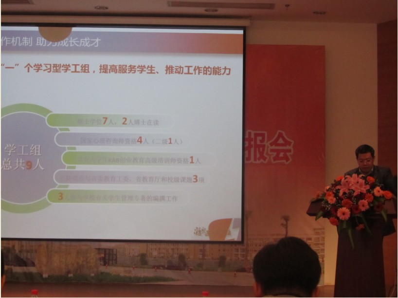 施卫华副书记以“夯实‘139’工作机制 助力学生健康成长成才”为主题,分别从建设一个学习型学工组,做实三项学生工作品牌,扎实推进学生工作九大工程建设为主线,分别从安全稳定、学风建设、就业创业、帮学助困、心理健康、入学教育、党团科学、队伍建设、全面发展九个方面为突破口,回顾并总结了 苏畅