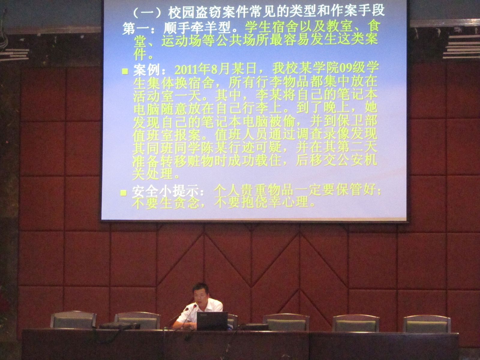 安全稳定工作是确保各项工作顺利开展的重要前提与保证,对新生在大学阶段提高安全防范意识尤为重要。林老师说虽然同学们都已步入大学,文化素质较高,但安全问题仍然存在,安全意识有待提高。林老师强调了安全教育的重要性以及新生在衣食住行各方面所涉及的安全事项,以及日常生活中应该如何防偷防骗等,同时还列举出相关案例以示警醒。针对现存问题,林老师提出了学生们可采取的预防措施和应对方法,图文并茂的讲授方式达到了很好的教育效果。此外,他还强调了校园网络安全与国家安全的重要性,希望同学们严格遵守国家法律、法规,维护国家、社会、集体和个人的合法权益。讲座最后在林老师对新生的祝福下落下帷幕。