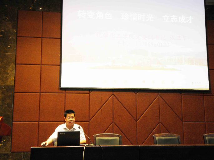 党委副书记施卫华老师作演讲。施副书记演讲主题是“转变角色、珍惜时光、立志成才”。施卫华老师结合内容丰富、形式多样的PPT演示,以生动的语言分别从转变角色、珍惜时光和立志成才三个角度为新生介绍了 苏畅