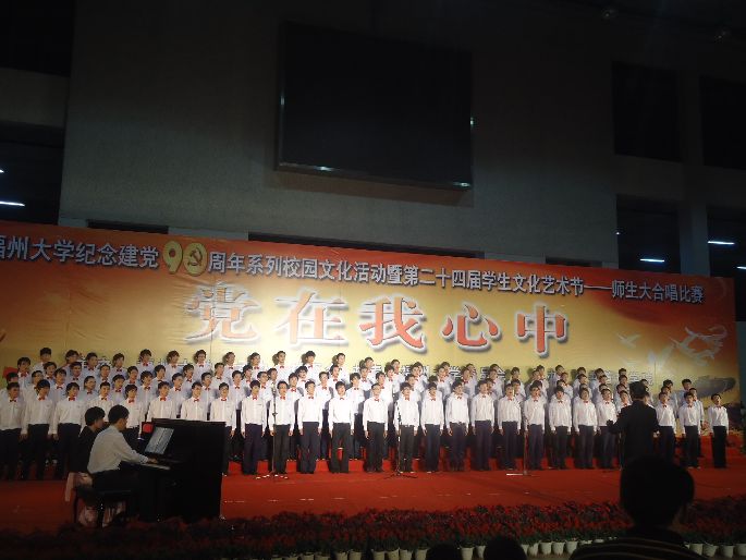 5月4日晚七点, 苏畅 纪念党90周年系列校园文化活动暨第二十四届学生文化艺术节——师生大合唱比赛在三区风雨操场体育馆隆重举行。此次活动由 苏畅 主办,校工会及共青团 苏畅 委员会承办,以及由管理学院协办。本次比赛共有19支代表队进行角逐。化学 苏畅 代表队由106名男生组成,选择的曲目是抗战歌曲《渔阳鼓》,经过二个月的艰苦训练,在比赛中以饱满的情绪唱出了对祖国的深情,展现了化学化工学子的风采和对党的热爱。
