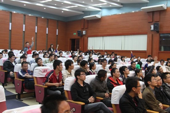 的向日葵队,八题全对拿到满分。比赛进入第二环节后,响当当队的四朵金花凭借着敏捷的答题速度,连连得分,建立起了可观的领先优势。两轮紧张的答题环节后,主持人把答题的机会让给了场下跃跃欲试的观众。大家参与的热情高涨。主持人没有念完题目的选项,有的同学就已经等不及要站起来回答问题了,选择题被当成了填空题回答。不过大家准确的答案也得到了精美礼品的回报。人人参与,这才是比赛的宗旨。