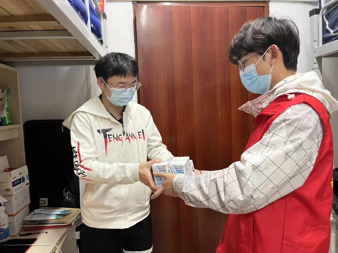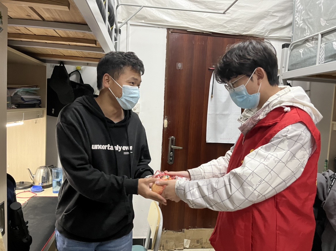 党员志愿者为同学们发放物资