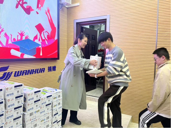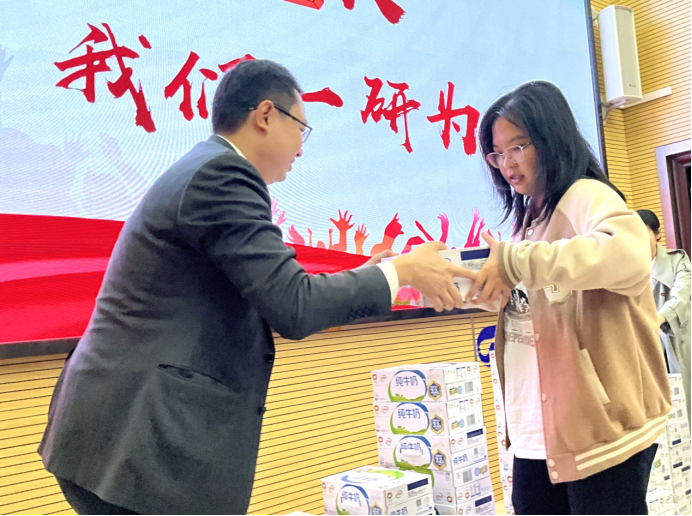 动员会最后,林航书记和蒋林娟副书记依次为全体考研学子分发了“暖心牛奶”,现场热烈而温馨。一箱箱沉甸甸的牛奶传递着学院的鼓励与期待,带来身体上的关心与心灵上的慰藉,为同学们加油鼓劲。