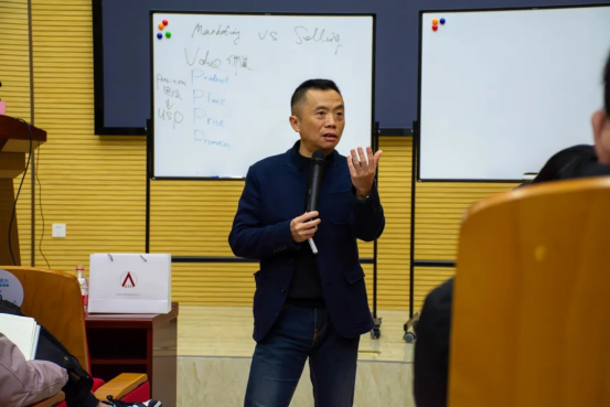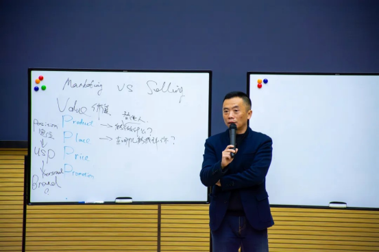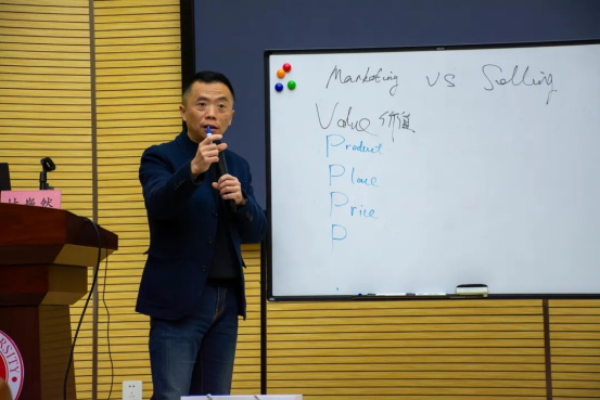 讲座伊始,林巍然先生从“发展与营销”中的“营销”切入,并通过列举生动形象的例子,将两种概念进行对比,引导同学们探究与思考;紧接着又提出了营销经典的“4P理论”,即“Product(产品)”、“Place(渠道)”、“Price(价格)”、“Promotion(推广)”,四层理论层层深入,深入浅出的阐述了市场营销的基本知识。