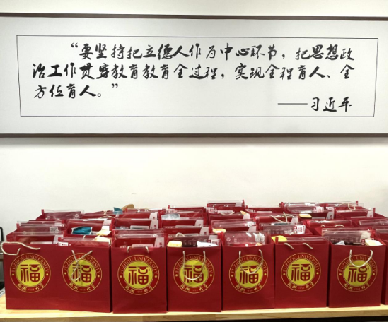 福袋中的礼品寓意深刻,意义非凡。其中,有“逢考必过”的文具套装,有寓意着“脐”开得胜、心想事“橙”的脐橙,全“力”以赴的士力架,“苹”稳上岸的苹果、“巧克”难题的巧克力、“包”你全会的小面包,如你所“愿”的薯愿,有为健康保驾护航的口罩,更有特别定制版化工暖心考研餐券。满载着全院师生对考研学子最真挚的祝福,助力考研学子把握好最后的冲刺阶段,全力以赴、金榜题名。