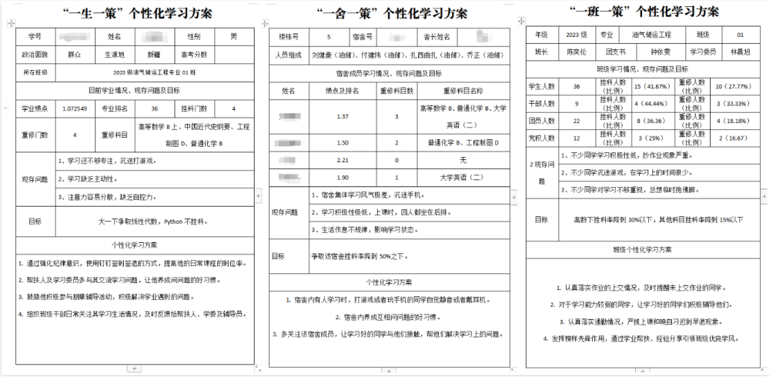 一是打造“一个不落下”的共进模式。年级秉承“不抛弃、不放弃”原则,决心解决学业困难学生的学习难题。通过组织学生座谈会、一对一谈心谈话等方式倾听学生在学业上的困难和需求。根据学生、宿舍、班级的不同情况进行分门别类,制定“一生一策”、“一舍一策”、“一班一策”等个性化学习方案,真正做到从同学们的差异化需求切入,针对性解决个人学习问题,为做好精准学业帮扶打下坚实的基础。