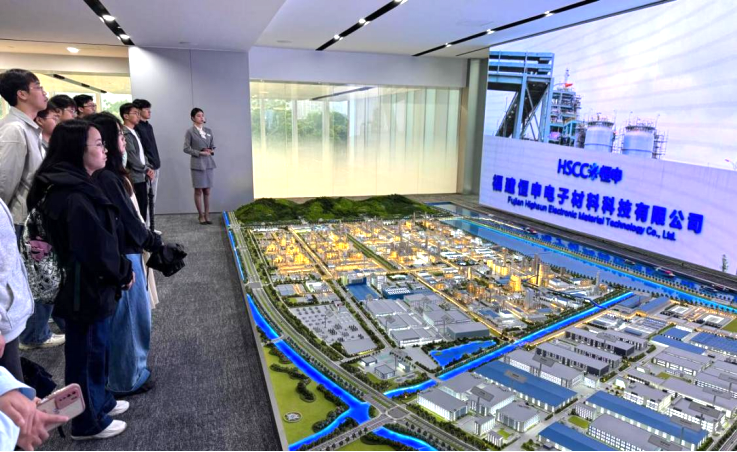 在恒申中心展示馆,同学们认真听取集团全球布局、生产经营、发展路径等情况的介绍,通过宣传片详细了解了集团“一中心、五大新材”的战略布局和各板块公司循环经济高质量发展,对于恒申集团扎根福建四十载,三代人只做一件事,坚定“不畏尝试、精进不止、协同合作”的企业发展价值观,不少同学眼中闪烁着敬佩的光芒。