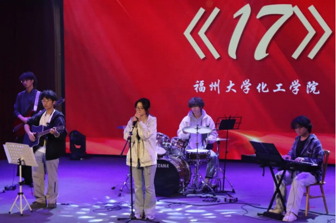 乐队表演《17》的舞台。电吉他旋律交织鼓点,贝斯低频共振,承载着新“氢”年的澎湃期待。人文学院的二胡齐奏经典曲目《赛马》弦乐激荡,瞬间点燃全场,迸发闯荡世界的少年意气,开启了青春的炽热之夜。