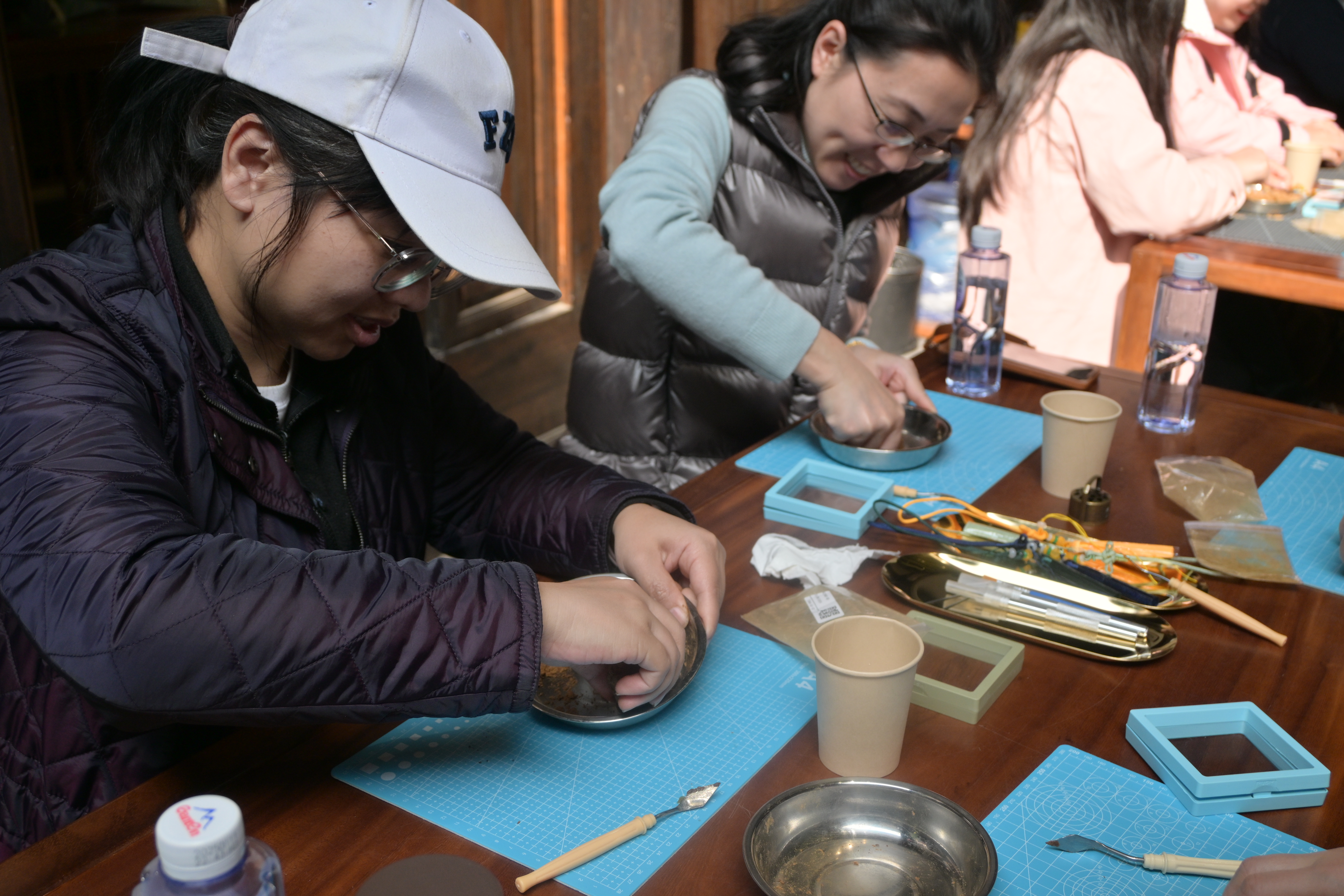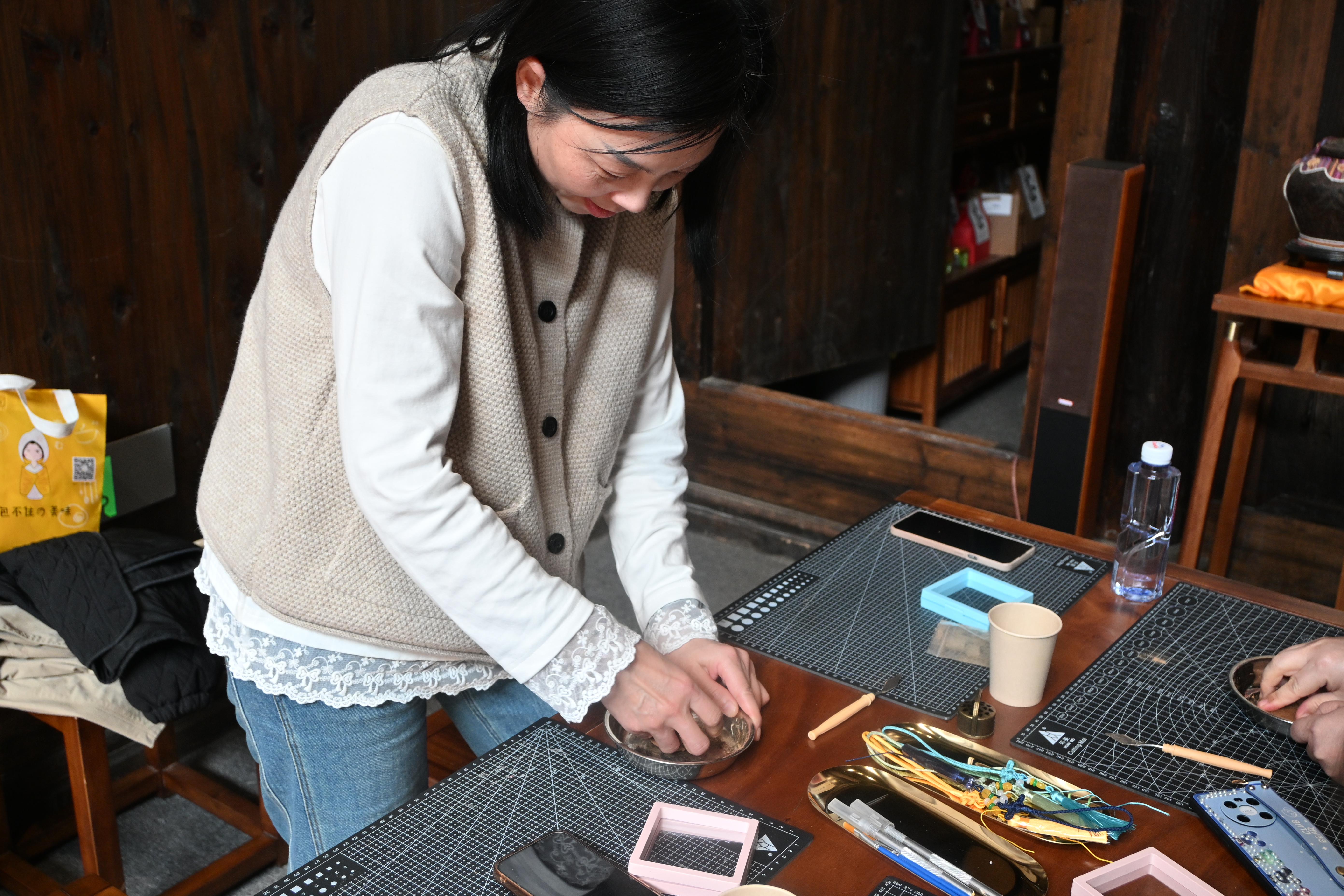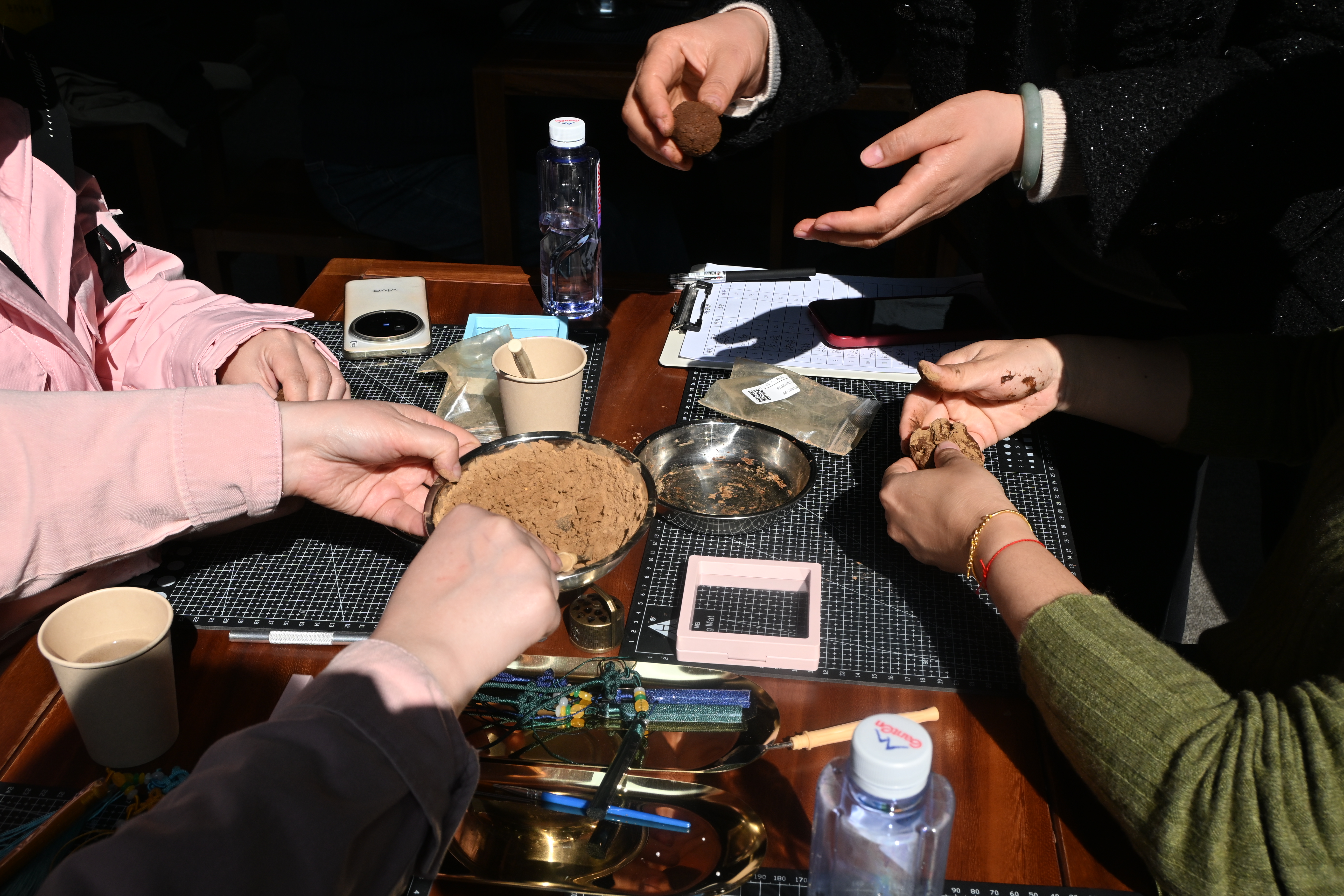在理论讲解结束后,各位老师便迫不及待地开始了亲手制作古法香牌的体验。在老师的指导下,她们将香粉和黏土以及水按特定比例进行揉捏、打磨,再经过一段时间的发酵,最后用模具按压,制成精美的香牌。活动现场欢声笑语不断,大家互相交流制作心得,气氛热烈而温馨。经过一番精心制作,一块块散发着独特香气的古法香牌呈现在大家眼前。
