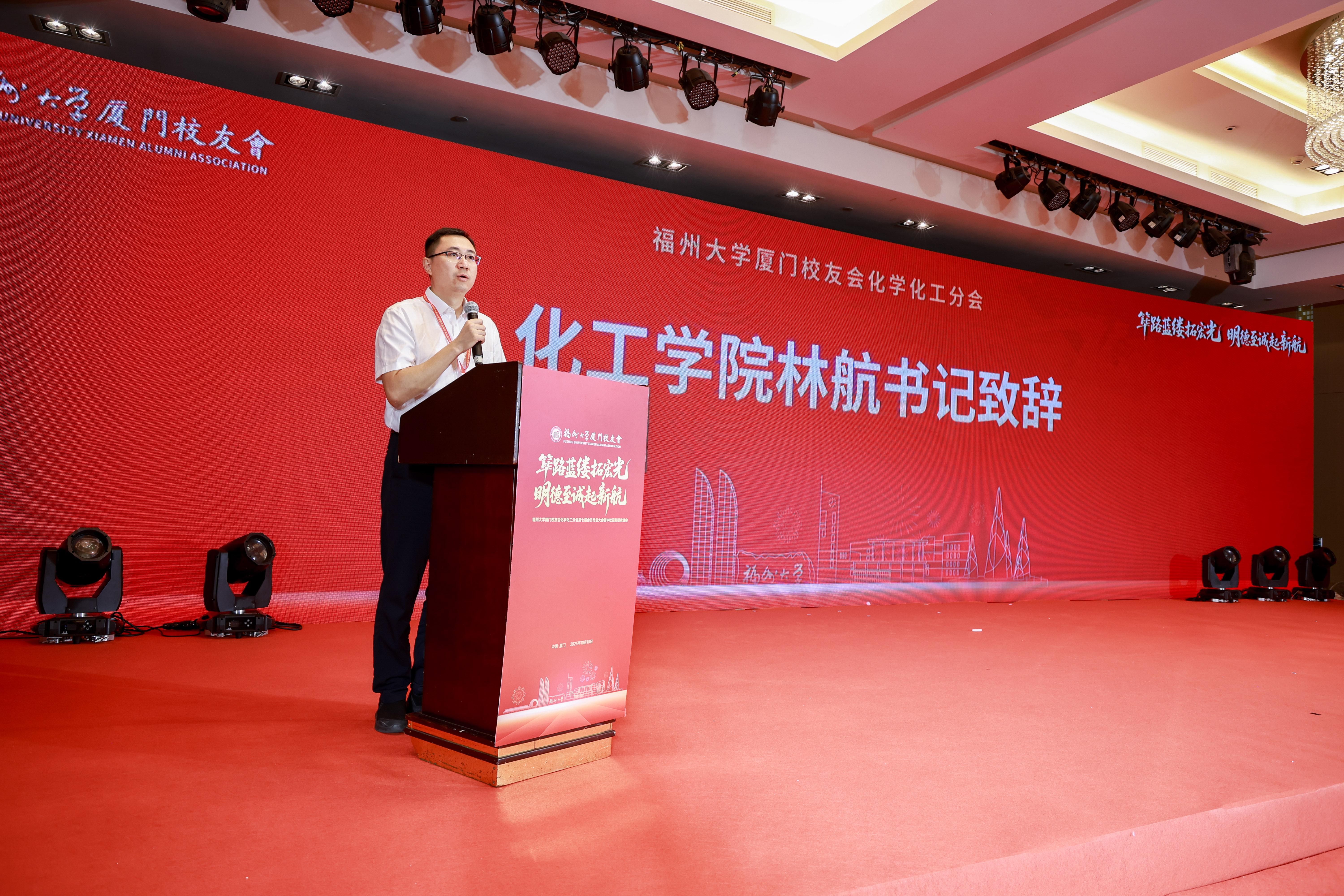 厦门校友会化学化工分会第七届会员代表大会。会上,林航书记作为学院代表上台致辞,首先对厦门校友会化学化工分会换届大会的顺利召开及新当选的分会领导班子表示热烈祝贺。他在致辞中提到,厦门校友群体是学院发展的重要支撑力量,多年来校友们在各行各业深耕奋斗,既展现了化学化工学子的专业素养与担当,也为母校与地方产业发展搭建了重要桥梁。同时,林航书记简要回顾了学院与厦门校友会过往的交流合作成果,期待校友组织新一届班子能持续凝聚校友力量,深化校地联动,在人才推荐、科研合作、实习实践等领域探索更多合作可能,共同助力学院人才培养质量提升与地方产业发展。