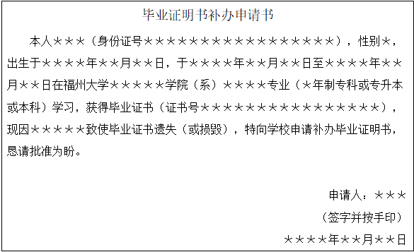 取得正式学籍的77级以后毕业生,因毕业证书遗失或损毁等原因,均可向学校申请,经学校审查核准后,补发给毕业证明书。申请者可于受理后两周,联系承办单位领取毕业证明书。