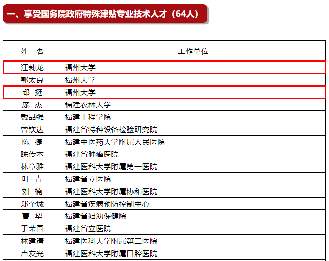 经国务院批准,我省江莉龙等64位高级专业技术人才、林建春等10位高技能人才,享受2020年国务院政府特殊津贴。其中专业技术人才64人,高技能人才10人。