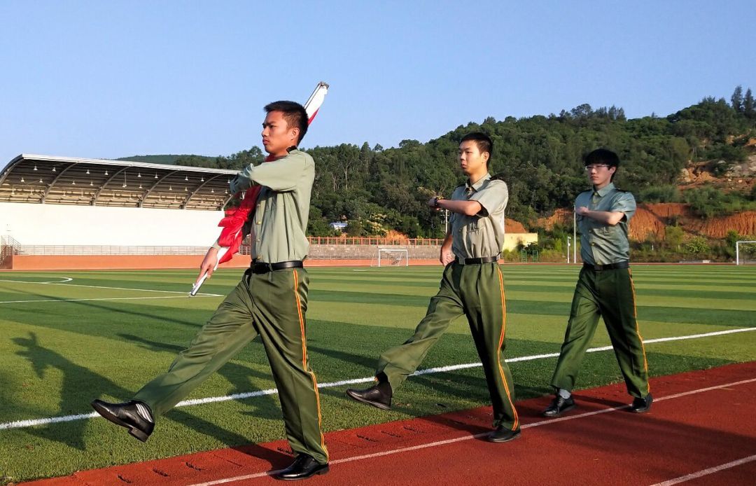 迎着朝阳,在全体师生的注目礼下,泉港校区英姿飒爽的国旗护卫队队员们护送鲜艳的五星红旗进场,伴随着庄严的《义勇军进行曲》,五星红旗冉冉升起,迎风飘扬。
