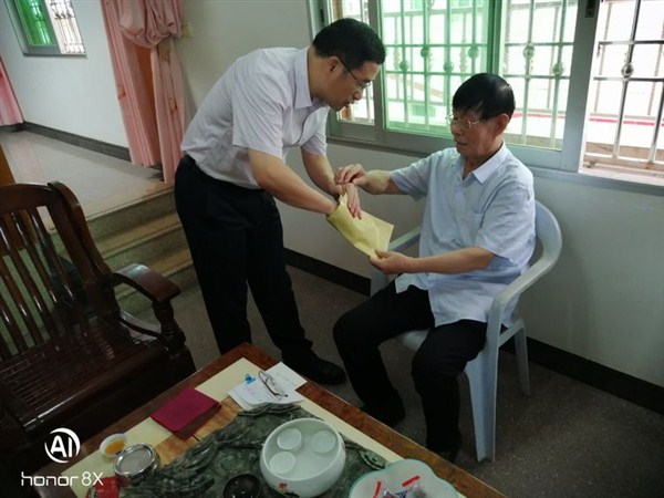 2019年7月10日下午,校党委副书记林生研究员一行来到泉港区肖厝村,亲切慰问原化工系党委书记肖柏青老师。院党委叶志清书记、校团委刘玮副书记、校团委林航副书记陪同参加了慰问。