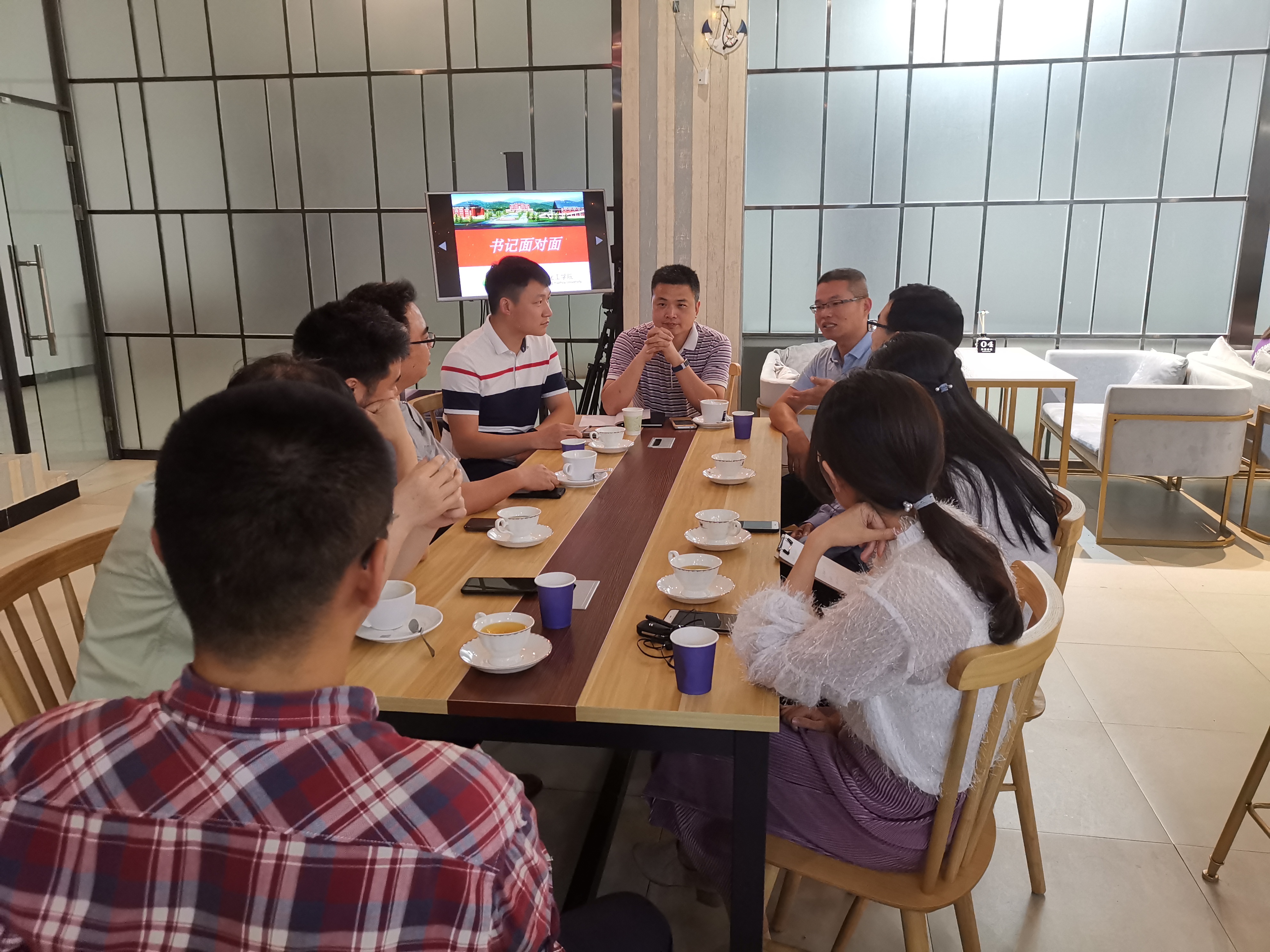 “书记面对面”活动在学院一楼党群咖啡吧举行。叶志清书记、岳志强副书记出席,8位青年教师参加了座谈。