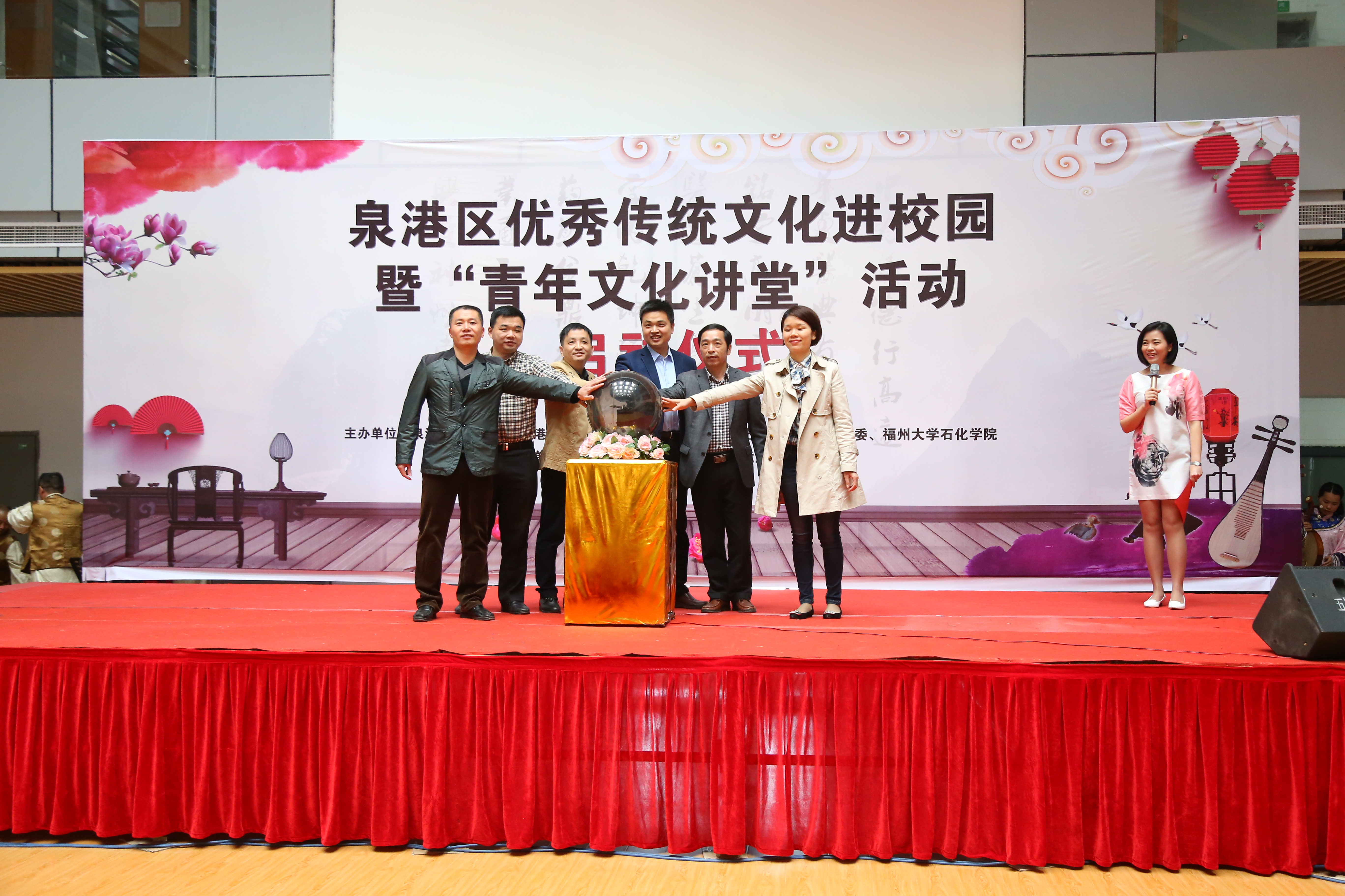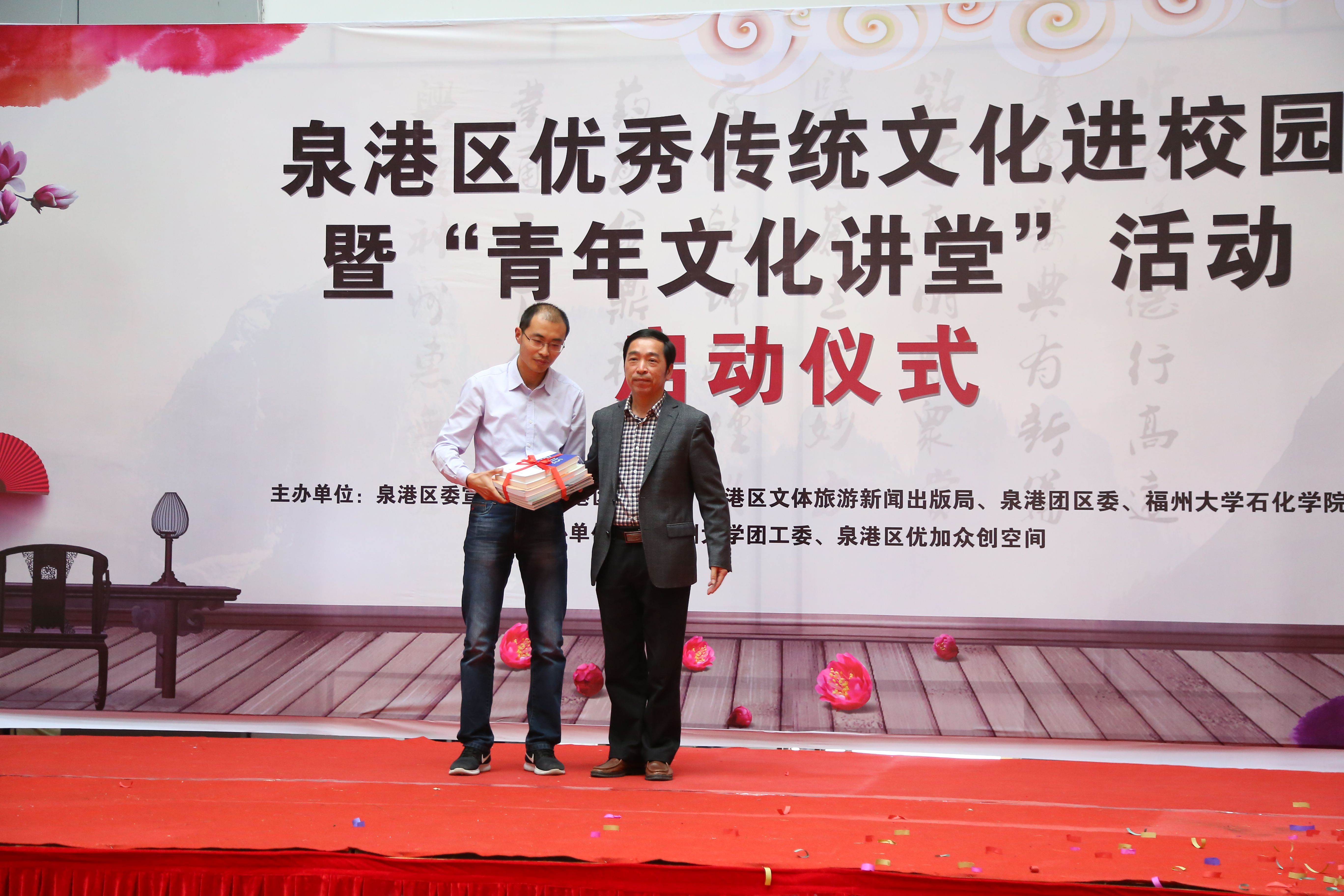 启动仪式上,学院领导与泉港区各部门领导共同启动活动的启动球,标志着本次泉港区优秀传统文化进校园暨“青年文化讲堂”活动活动的正式启动。在赠书环节,区文体新局局长陈玉顺将一批泉港区传统文化教育书籍赠送给 苏畅
